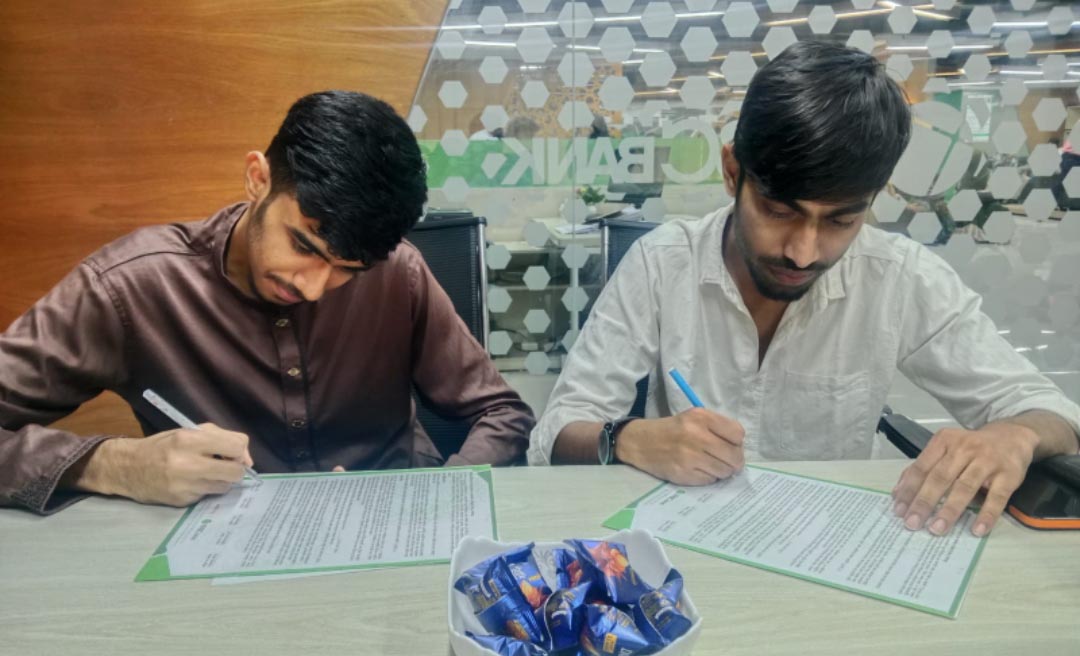 শিশু নোবেলের জন্য মনোনীত মাহবুব আল হাসান (বামে) ব্যাংক হিসাব খুলছে -পূর্বকণ্ঠ