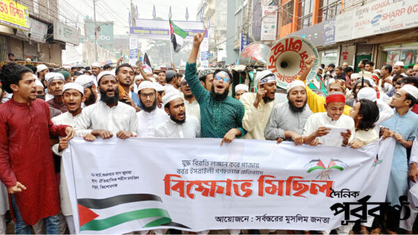 যুদ্ধ বিরতি লংঘন করে গাজায় নিরস্ত্র ফিলিস্তিনিদের ওপর ইসারায়েলের নারকীয় হামলার প্রতিবাদে কিশোরগঞ্জে বিক্ষোভ মিছিল হয়েছে। শুক্রবার বাদ জুমা শহরের শহীদি মসজিদের সামনে থেকে সর্বস্তরের মুসলিম জনতার ব্যানারে গুঁড়ি গুঁড়ি বৃষ্টির মধ্যে মিছিলটি শুরু হয়ে শহরের বিভিন্ন সড়ক প্রদক্ষিণ করে। এসময় মিছিলকারীরা স্বাধীন ফিলিস্তিন রাষ্ট্র প্রতিষ্ঠা ও ইসরায়েলের ধ্বংস কামনা করে বিভিন্ন শ্লোগান দেন। সেই সাথে ফিলিস্তিনিদের সমর্থন ও ইসরায়েলের বিরুদ্ধে রুখে দাঁড়ানোর জন্য বিশ্ববাসীর প্রতি আহবান জানানো হয়।