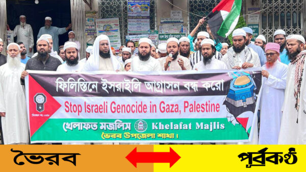 যায়নবাদী বর্বর ও সন্ত্রাসী রাষ্ট্র ইসরাইল কর্তৃক ফিলিস্তিনি অসহায় ও নিরীহ মানুষ হত্যার প্রতিবাদে খেলাফত মজলিস ভৈরব পৌর শাখার উদ্যোগে ঢাকা-সিলেট মহাসড়কের দুর্জয় মোড় নুরানী মসজিদের সামনে ২১ মার্চ শুক্রবার জুম্মার নামাজের পর বিক্ষোভ মিছিল অনুষ্ঠিত হয়েছে।