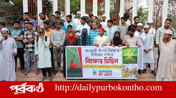 আওয়ামী লীগের বিচার ও নিষিদ্ধের দাবিতে কিশোরগঞ্জে ‘ওয়ারিয়রস অব জুলাই’ সংগঠনের ব্যানারে বিক্ষোভ সমাবেশ হয়েছে। ২২ মার্চ শনিবার দুপুরে শহরের সরকারি গুরুদয়াল কলেজের শহীদ মিনার চত্বরের সমাবেশে বক্তৃতা করেন সংগঠনের আহবায়ক কনক রেজা, সদস্য সচিব আশরাফুল ইসলাম নাদিম, জুলাই আন্দোলনের সংগঠক আশরাফ আলী সোহান, স্বর্ণা, গিয়াস উদ্দিন তালুকদার প্রমুখ।