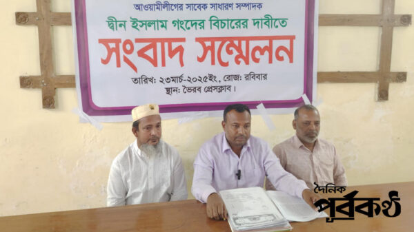 ভৈরবে ক্রয়কৃত জমিতে নির্মাণ কাজ করতে বাধা, একাধিক মিথ্যা মামলা দিয়ে হয়রানি করার প্রতিবাদে ও শিমুলকান্দি ইউনিয়ন আওয়ামী লীগের সাবেক সাধারণ সম্পাদক দ্বীন ইসলাম গংদের বিচারের দাবীতে সংবাদ সম্মেলন করেছে ভুক্তভোগী সাকিব আহমেদ নামে এক ব্যক্তি। ২৩ মার্চ শনিবার দুপুরে ভৈরব প্রেসক্লাব মিলনায়নে আয়োজিত সংবাদ সম্মেলনে ভুক্তভোগী এসব অভিযোগ করেন।