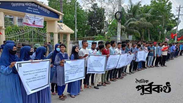 কারিগরি ছাত্র আন্দোলনের চলমান ৬ দফা দাবিতে গতকাল শনিবার দুপুরে কিশোরগঞ্জ পলিটেকনিক ইনস্টিটিউটের শিক্ষার্থীরা প্রতিষ্ঠানের ফটকে ব্যানার টানিয়ে মানববন্ধন করেছেন। কিশোরগঞ্জ-করিমগঞ্জ সড়কে অনুষ্ঠিত ঘন্টাব্যাপী মানববন্ধনে শিক্ষার্থীরা ৬ দফা দাবি সংবলিত প্লাকার্ড বহন করেন। এসময় শিক্ষার্থীরা রক্ত দিয়ে হলেও ৬ দফা আদায়ের দাবিতে শ্লোগান দেন। কুমিল্লা পলিটেকনিকের শিক্ষার্থীদের ওপর হামলার বিচারও দাবি করেন। মানববন্ধনে বক্তৃতা করেন তৃতীয় পর্বের ছাত্র কাউসার আহমেদ দূরন্ত, প্রথম পর্বের ছাত্রী পূজা বিশ্বাস, জোনাকি শেখ প্রমুখ। মানববন্ধন চলাকালে সড়কে যানবাহন চলাচল স্বাভাবিক ছিল।