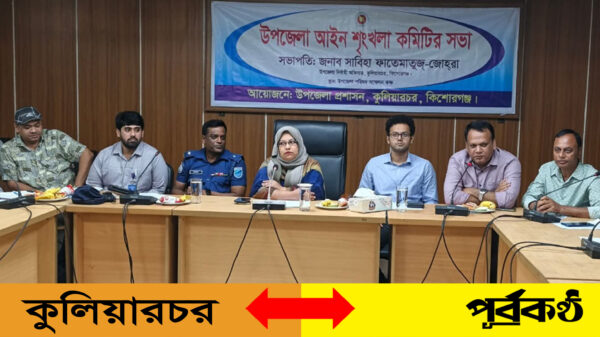 কিশোরগঞ্জের কুলিয়ারচরে উপজেলা আইনশৃঙ্খলা কমিটির সভা অনুষ্ঠিত হয়েছে। গত ১৯ জুন বৃহস্পতিবার সকাল ১১টার দিকে উপজেলা পরিষদ মিলনায়তনে উপজেলা প্রশাসনের আয়োজনে স্বরাষ্ট্র মন্ত্রণালয়ের রূপরেখা অনুযায়ী নতুন কমিটির প্রথম সভা অনুষ্ঠিত হয়।