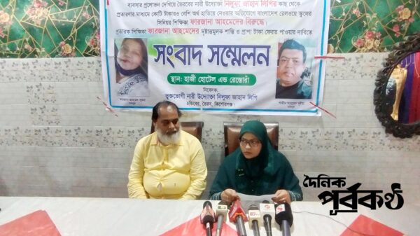 কিশোরগঞ্জের ভৈরবে ব্যবসার প্রলোভন দেখিয়ে নারী উদ্যোক্তা নিলুফা জাহান লিপির কাছ থেকে প্রতারণার মাধ্যমে কোটি টাকা হাতিয়ে নেয়ার অভিযোগ উঠেছে বাংলাদেশ রেলওয়ে স্কুলের সিনিয়র শিক্ষিকা ফারজানা আহমেদ সুমনার বিরুদ্ধে। এঘটনায় শিক্ষিকা ফারজানা আহমেদের দৃষ্টান্তমুলক শাস্তি ও প্রাপ্য টাকা ফেরত পেতে সংবাদ সম্মেলন করেন ভুক্তভোগী।