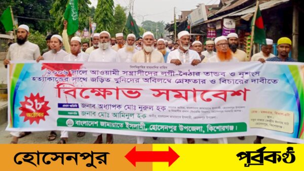 ২০০৬ সালে আওয়ামী সন্ত্রাসীদের দ্বারা সংঘটিত লগী-বৈঠার তাণ্ডব ও নৃশংস হত্যাকাণ্ডের সাথে জড়িত খুনিদের দ্রুত গ্রেপ্তার ও দৃষ্টান্তমূলক বিচারের দাবীতে মঙ্গলবার বিকালে উপজেলা জামায়াতে ইসলামী এক বিক্ষোভ সমাবেশ ও মিছিল অনুষ্ঠিত হয়। মিছিলটি পৌর শহরের প্রধান প্রধান সড়ক প্রদক্ষিণ করে।