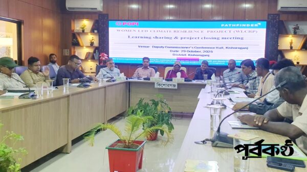 পাথফাইন্ডার ইন্টারন্যাশনালের সহযোগিতায় কিশোরগঞ্জে পপি ও ডব্লিউ.এল.সি.আর প্রকল্পের লার্নিং শেয়ারিং ক্লোজিং কর্মশলা অনুষ্ঠিত হয়েছে। গতকাল বুধবার কালেক্টরেট সম্মেলন কক্ষে জেলা প্রশাসক ফৌজিয়া খানের সভাপতিত্বে কর্মশালায় জেলা ও উপজেলার বিভিন্ন সরকারি দপ্তরের কর্মকর্তাসহ বিভিন্ন অংশীজন অংশগ্রহণ করেন। সঞ্চালনা করেন পাথফাইন্ডারের রিজেলিয়েন্স অফিসার মো. কামরুল ইসলাম। মালটিমিডিয়ার মাধ্যমে প্রকল্পের প্রগতি, অগ্রগতি, উল্লেখযোগ্য অর্জন, অর্জিত ফল ও প্রভাব এবং প্রকল্পের শিখন বিষয়ে উপস্থাপন করেন ডব্লিউ.এল.সি.আর প্রকল্পের সমন্বয়ক সত্যেন্দ্রনাথ মিত্র। কর্মশালার সার্বিক ব্যবস্থাপনায় ছিলেন প্রকল্পের মনিটরিং ও মূল্যায়ন অফিসার সুদাম রুদ্র ও সংশ্লিষ্ট ফিল্ড অফিসারগণ। কর্মশালার অন্যতম উদ্দেশ্য ছিল প্রকল্পের প্রগতি, অগ্রগতি, অর্জিত ফল ও প্রভাব এবং প্রকল্প থেকে বহুবিদ শিখন অংশগ্রহণকারীদের সাথে শেয়ার করা এবং পরবর্তী করণীয় সম্পর্কে সকলের মূল্যবান মতামত ও সুপারিশ গ্রহণ। কর্মশালায় জেলা-উপজেলা কর্মকর্তা ও স্টেকহোল্ডারগণ তাদের কর্মশালায় অর্জিত শিক্ষা, ধারণা ও অভিজ্ঞতার কথা তুলে ধরেন। আলোচনায় অনেকেই এ জেলায় অত্র প্রকল্পের মেয়াদ সম্প্রসারণের প্রয়োজনীয়তার কথা তুলে ধরেন।