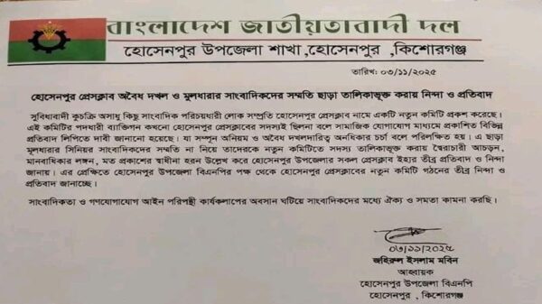 কিশোরগঞ্জের হোসেনপুর প্রেসক্লাবের নতুন কমিটি গঠনের ঘটনায় ক্ষোভ ও নিন্দা জানিয়েছে হোসেনপুর উপজেলা বিএনপি। দলটির পক্ষ থেকে বলা হয়েছে, এটি মূলধারার সাংবাদিকদের অবজ্ঞা করে, অবৈধভাবে দখলের উদ্দেশ্যে গঠিত একটি কমিটি।