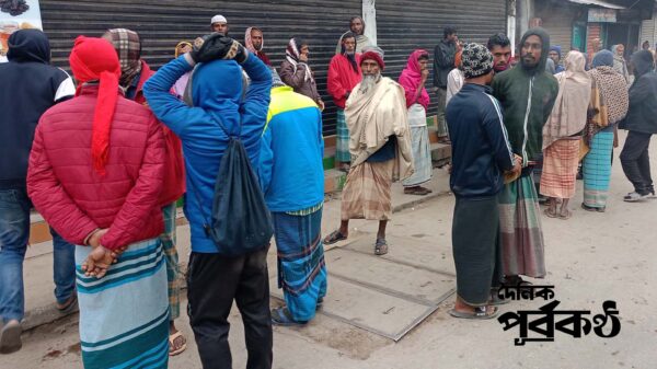 আখড়াবাজার শ্রমের হাটে গিয়ে দেখা গেছে, অর্ধশতাধিক বিভিন্ন ধরনের শ্রমিক শীতের কাপড় মুড়িয়ে ক্রেতার অপেক্ষায় দাঁড়িয়ে আছেন। সেখানে কথা হয় শহরতলির রশিদাবাদ এলাকার মাটিকাটা শ্রমিক জুয়েল মিয়ার সাথে। তিনি বললেন, ‘যত শীতই থাউক, কাম না করলে পরিবার নিয়া কি খায়াম (খাবো) কী। এই শীতে বাড়িত বাইয়া থাকলে চলতো না। এর লাইগাই কাম করতাম আইছি। কিন্তু কেউ কামে নিতাছে না। অহন তো সাহায্য লইয়া বাঁচন লাগবো। সরহার আমরারে সাহায্য দেউক।’ এভাবেই নিজের অসহায়ত্বের কথাগুলো উচ্চারণ করছিলেন জুয়েল মিয়া। এই শ্রমের হাটে এসেছিলেন শহরের হারুয়া এলাকার রাজমিস্ত্রী আইন উদ্দিনও। তিনিও হতাশা ব্যক্ত করে জানালেন, এই শীতে মানুষ কাজও করাতে চায় না। ফলে বাড়ি ফিরে যেতে হবে। কাজ না পেলে পরিবার নিয়ে কষ্টে দিন কাটাতে হয়। মানুষের কাছ থেকে ধারকর্জ করে কম খরচে চলতে হয়। এসব কর্জের টাকাও তো শোধ করতে হবে। অন্যান্য কায়িক শ্রমে নিয়োজিত শ্রমজীবীদের পরিবারেও চলছে দুর্দিন।